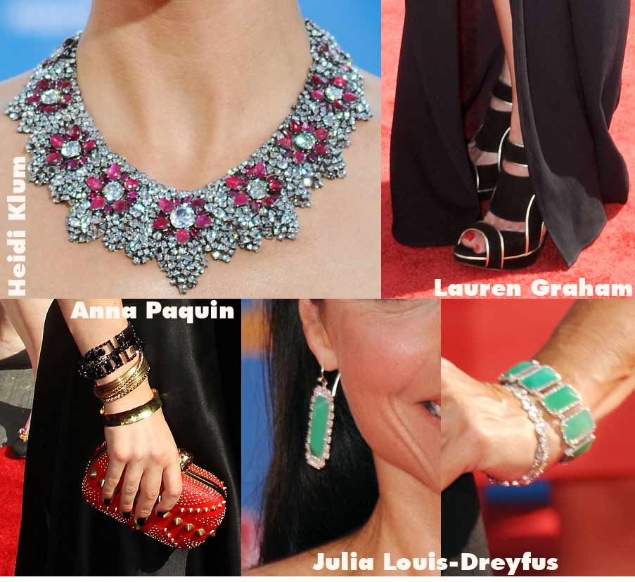 Heidi Klum optou por uma versão minimalista (de tamanho) mas o colar, inshalá, riqueza pura! Não sei se esse sapato da LaurenLai combinava com o vestido, mas ele é super imponente. Anna Paquin, representou a cota que prestigia – e pode – usar McQueen. E minha musa Old Christine, apavorando com jóias incríveis!