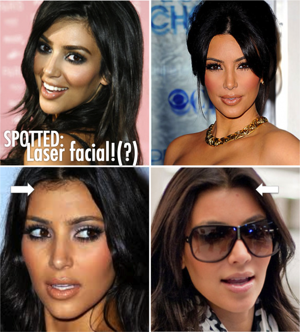Falando de uma maneira – bem – mais científica, os mais detalhistas notaram que Kim Kardashian, não satisfeita em rechear sua testa de toxina butolínica, também aplica laser nela. Dizem que sua origem armênia faz com que ela tenha profusões de pelo, dado esse infortúnio genético, Kim passa laser, conforme as fotos acima mostram muito mais ou menos bem.