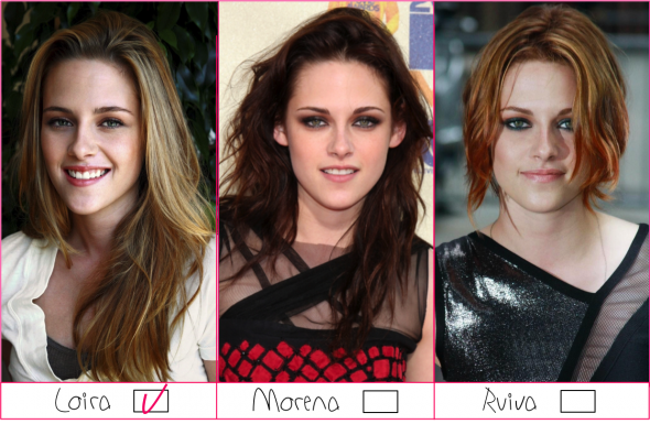 Uma que me surpreendeu loira, Kristen Stewart. Não sei se essa é a cor natural dela (é?), mas acho que ela fica mais soft loira, com cara de californian girl, já o morena fica mais intensa, que ela também fica muito bem, porém é o clássico dela. Ruiva também ficou legal, adoro aquela foto da trança clássica. Taí, acho que KStew fica bem com as 3 cores.
