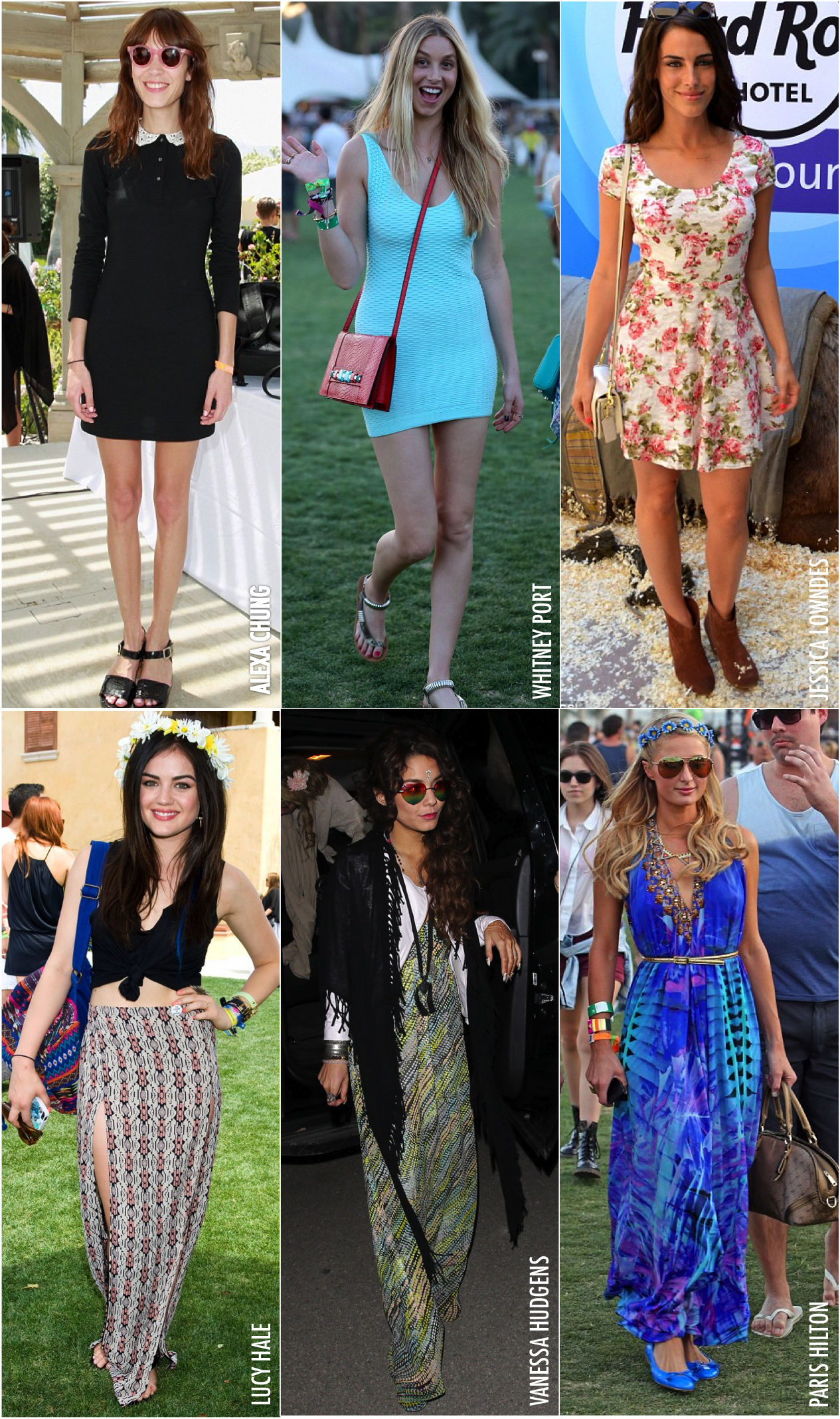 Agora os vestidos! Além do festival propriamente dito, rolam várias festas paralelas na cidade onde dá até pra subir no salto e usar um vestido. Alexa Chung estava numa dessas e com vestido gracinha, só não entendi essa sandália, tipo aquelas que a gente usava em 1993, parente do nauru. Whitney Port foi com um tubinho básico, super confortável pro evento, como não dá pra ver pela foto. Jessica Lowndes foi florida + botinha.