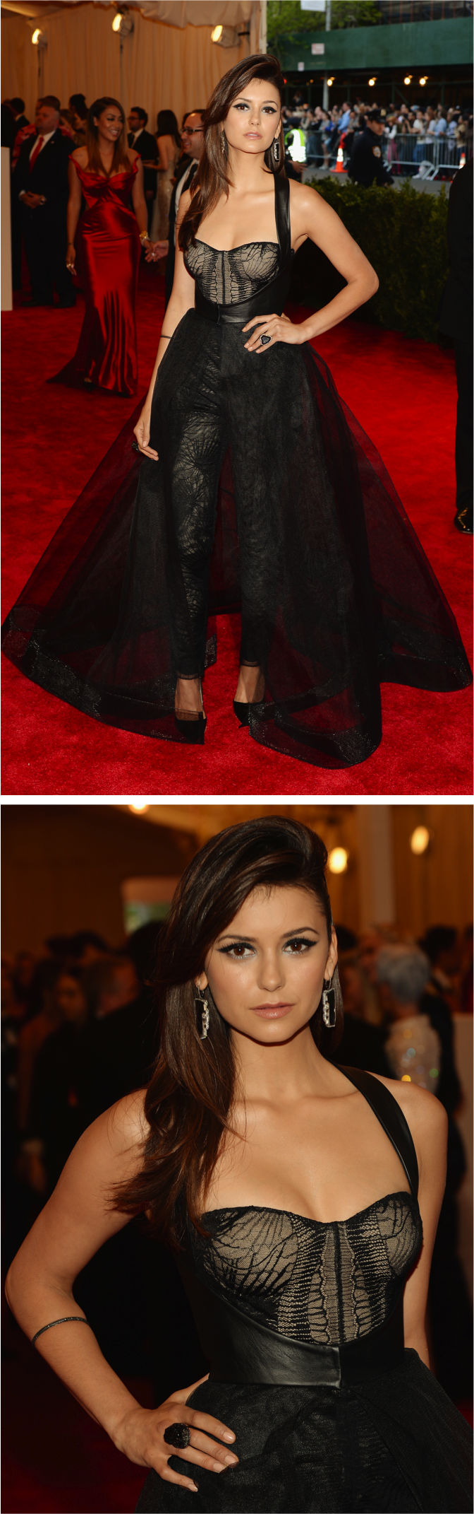 Prevejo divergências no look da Nina Dobrev! A queridinha de vocês foi ousada sim, ponto pra ela, agora ainda tô sem opinião formada quanto ao look. Esse mix saia + calça é sempre polêmico, daí a dela tem um quê de giga peplum, meio transparente, com um corset, enfim, uma mistura esquisita. Posso amar num futuro distante (fim da noite), mas no momento apenas acho confuso!