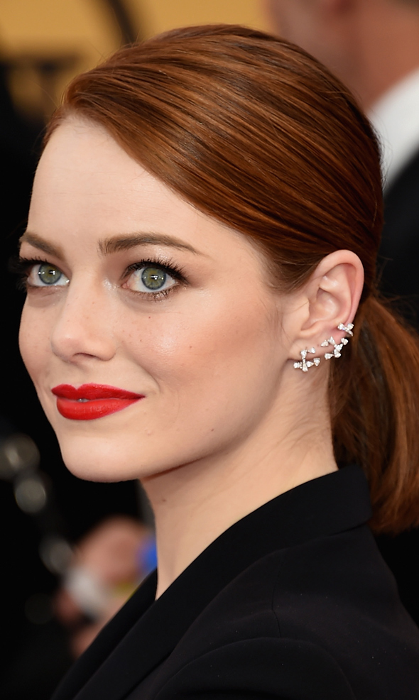 Emma Stone foi impecável e foco total no batom vermelho LINDO! Provavelmente é Revlon (saberemos em breve) e tem um acabemento seco, mas com um ligeiro reflexo, dá pra perceber também que o batom deu uma extrapolado na linha da boca!