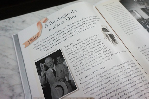 Explico, o livro, além das fotos nas páginas, vem com “extras” que vão de reproduções do primeiro convite do desfile da marca, passando por dezenas de croquis, releases, infos internas da marca e outros fatos, ilustrados de forma até mais lúdica, única e muito charmosa, assim como Dior.